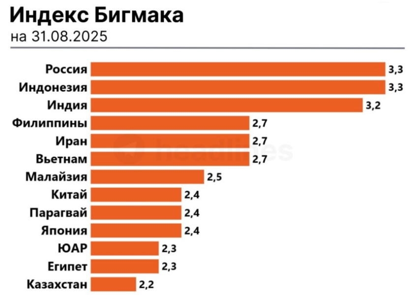 Согласно предоставленному графику на 31 августа 2025 года, Россия делит первое место с Индонезией по цене Биг Мака среди перечисленных стран — 3,3 доллара. Это выше, чем в Индии (3,2 доллара), Филиппинах, Иране и Вьетнаме (по 2,7 доллара), но все равно значительно ниже американского уровня.