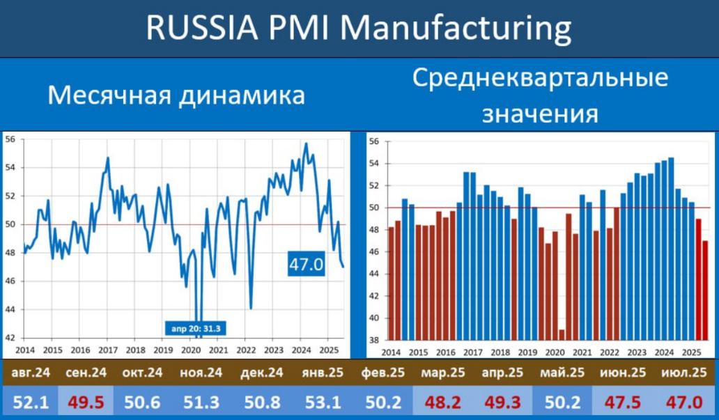 Свежие данные индекса Russia PMI Manufacturing в обрабатывающей промышленности показывают очередное снижение до 47 пунктов против предыдущего снижения в июне в 47,5 пунктов. Но что более интересно, так это то, что среднеквартальные значения за последнее полугодие тоже отрицательны. Это говорит о том, что условия работы большинства российских обрабатывающих производств существенно ухудшились. Объемы производства и заказы продолжают снижаться.