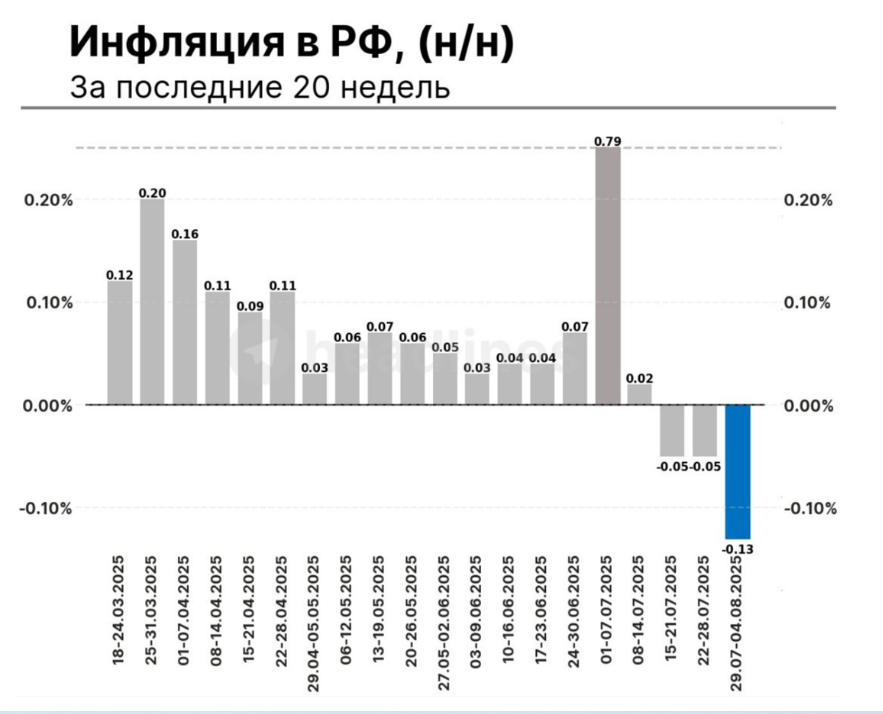 Последняя неделя вновь демонстрирует нам отрицательную инфляцию в -0,13%, что говорит о том, что цены снижаются. Здесь важно не столько само снижение, хотя оно рекордное с 2022 года, сколько динамика снижений подряд — это уже 3-я неделя. По нашему мнению, снижение цен связано как с сезонными факторами- падения цен на овощи, так и совокупным падением спроса. Последний снижается на фоне замедления экономики.