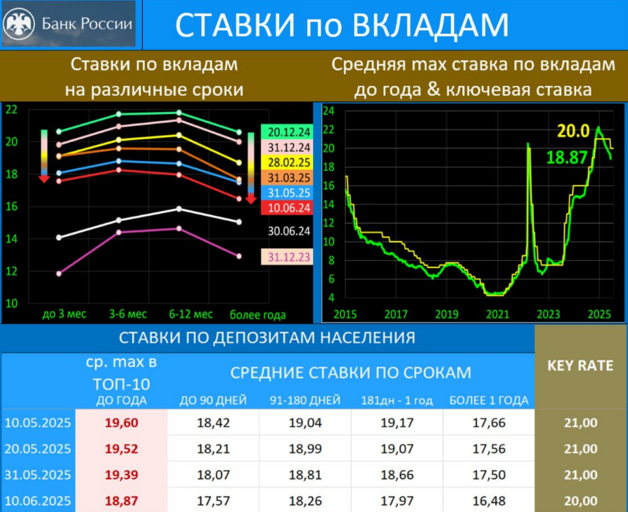Свежая статистика ЦБ констатирует, что средняя максимальная ставка по вкладам физлиц до 1 года в банках ТОП-10 опустилась до 18,87% годовых. При этом максимальный пик ставки был зафиксирован в декабре 2024 года в размере 22,28%. От пика ставка снизилась на 3,41% за последние 6 месяцев.