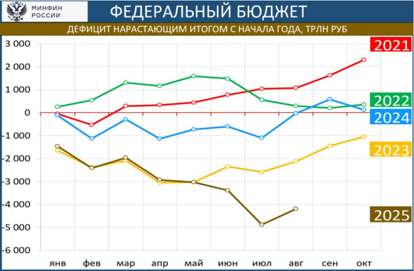 Август принёс кратковременную передышку — профицит в 686 млрд рублей, обеспеченный разовыми поступлениями от дивидендов госбанков и сезонно низкими расходами. Накопленный дефицит уже превысил годовой целевой показатель, утвержденный в июньской бюджетной корректировке.