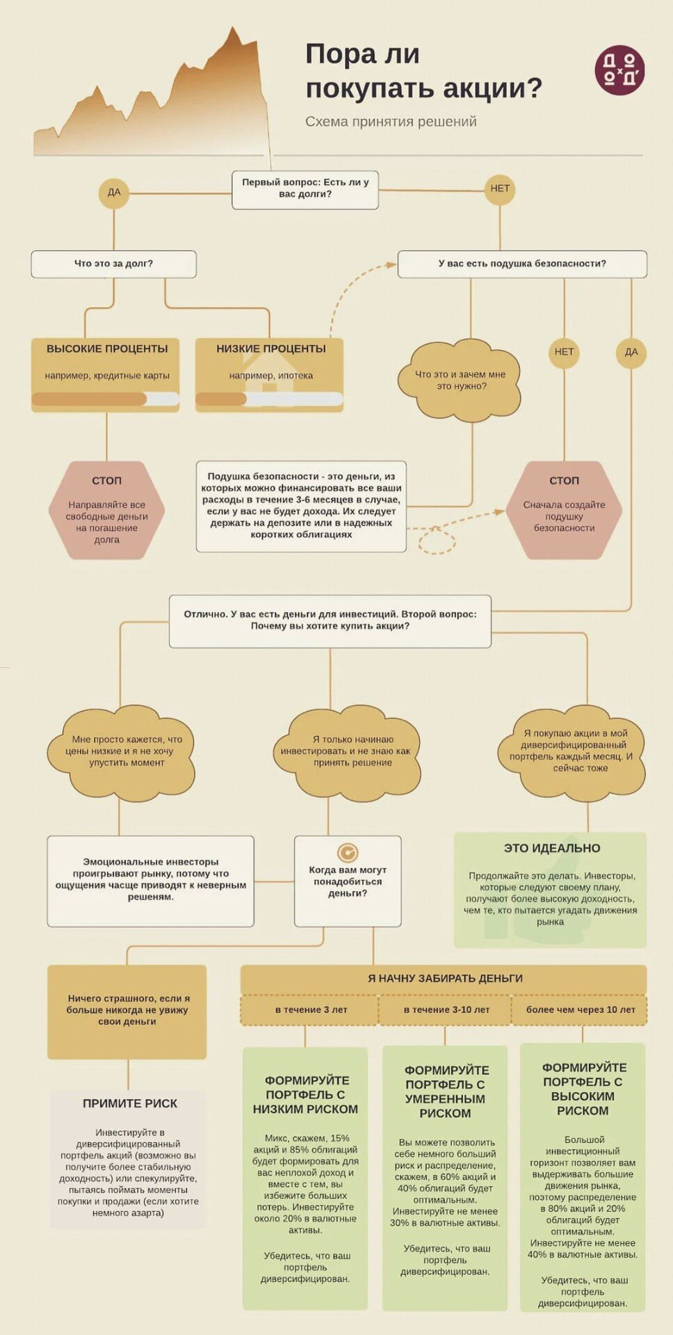 Следуя схеме, вы можете понять, можно ли начинать инвестировать сейчас или стоит подождать. Общие выводы вполне согласуются с традиционным подходом к финансовому консультированию. Очевидно, что если у вас есть долги, то инвестировать не стоит, лучше сосредоточиться на погашении кредитов. А если долгов нет, и есть желание и любая стартовая сумма, то можно начинать.