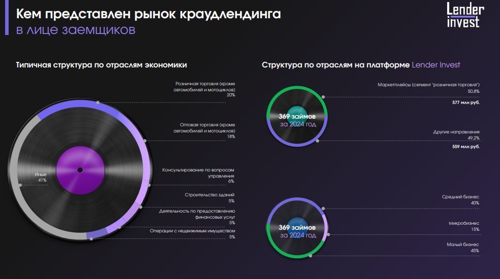 Внедренные на сайте lender Invest стратегии инвестирования, насыщенные аналитическим, информационным и образовательным контентом аккаунты в соцсетях, открытые чаты с обратной связью направлены на обучение инвесторов принципам разумного финансового поведения. Через аналитику рынка мы показали, как эффективно собрать портфель, расширяя собственные возможности. Поскольку на прибыль рассчитывает тот, кто может работать с разными активами. Чтобы выявить наиболее кредитуемые сферы, мы представили соотношение заемщиков по отраслям экономики в секторе краудлендинга в целом и портфеле платформы в частности.