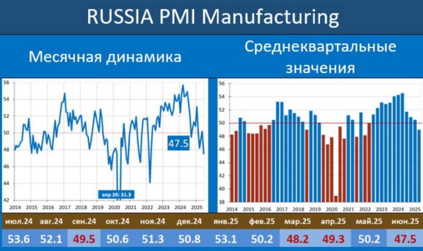 Согласно свежим данным S&P Global, индекс деловой активности российских промышленников в июне после роста в мае вновь ушел в отрицательную зону и составил 47,5 пунктов.