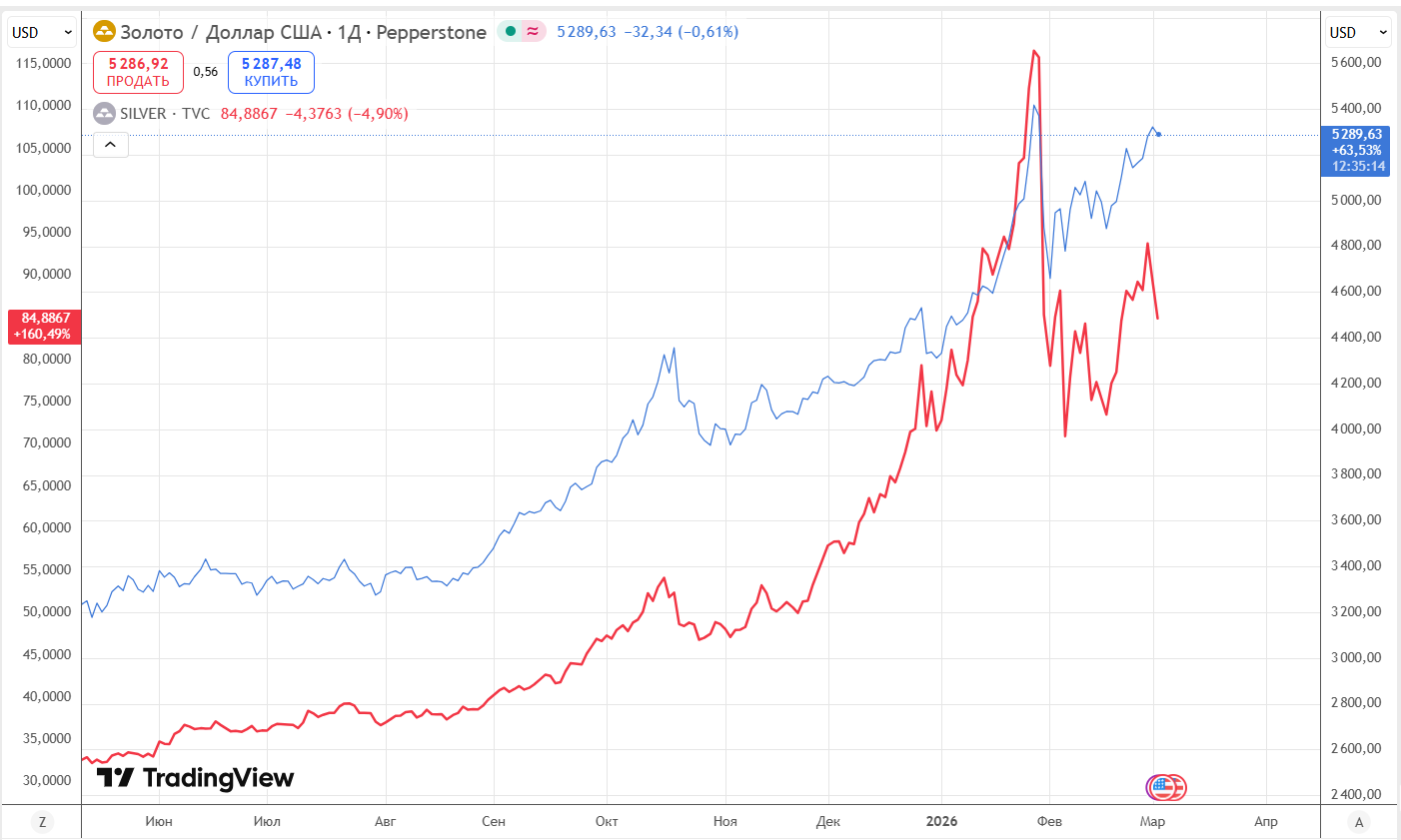 Начало 2026 года выдалось крайне волатильным для рынка драгоценных металлов. После стремительного ралли, в ходе которого золото прибавило феноменальные 74% за прошедший год, в конце января мы наблюдали жесткую коррекцию — котировки обвалились ниже исторического рубежа в 5000 долларов за унцию. Однако февраль показал неожиданную картину восстановления, в которой пути золота и серебра кардинально разошлись.