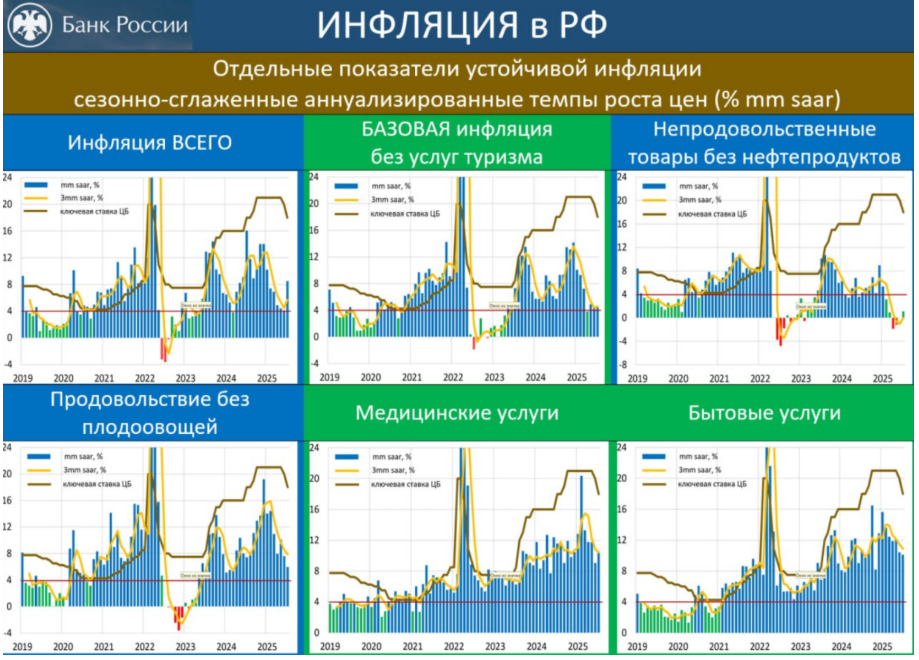 Интересно, что если мы очистим инфляцию от этого всплеска, а также от цен на самые волатильные товары (овощи, авиабилеты, фрукты), то окажется, что базовый темп роста цен составил всего 2,3%. Другими словами, это означает, что инфляционное давление в целом можно охарактеризовать как ослабевающее, пусть и не такими быстрыми темпами, как хотел бы ЦБ. Показатели устойчивой инфляции, которые отражают долгосрочные тенденции в экономике, находятся чуть выше целевого уровня в 4%.