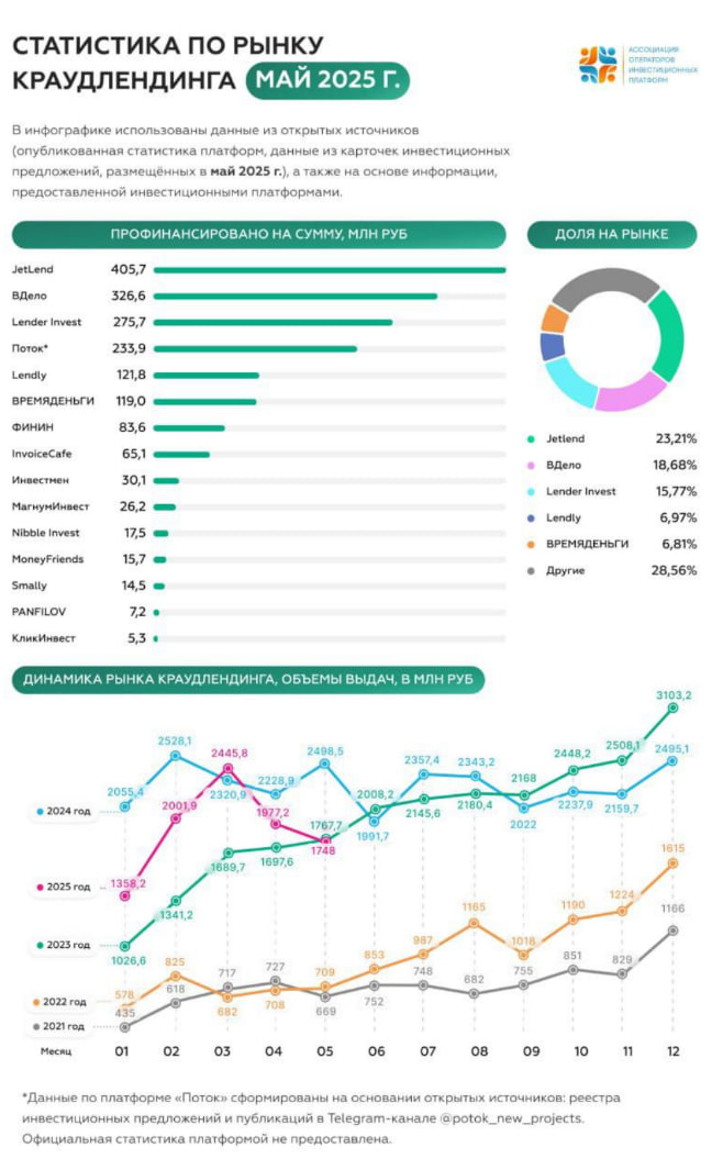Сегодня Ассоциация операторов инвестиционных платформ представила свежую статистику по результатам работы краудлендинговых платформ за май текущего года.