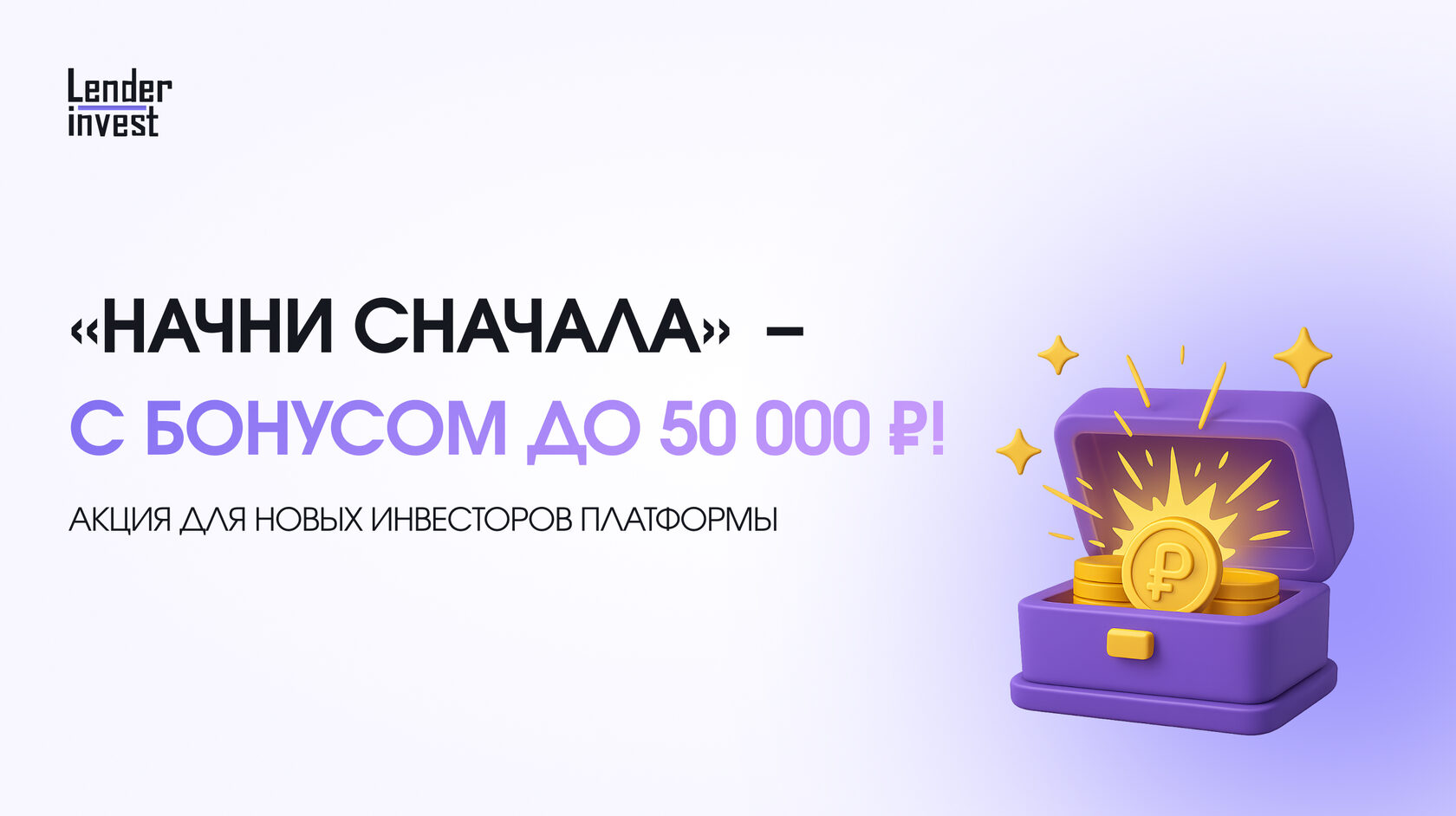 «Начни сначала» — это стимулирующая акция, созданная для новых инвесторов платформы, которые имели опыт потери денежных средств в краудлендинге. В рамках программы Lender Invest предоставляет бонус до 50 000 рублей, который может составлять до 5% от суммы первой инвестиции с 1 по 30 июня 2025 года на нашей платформе.